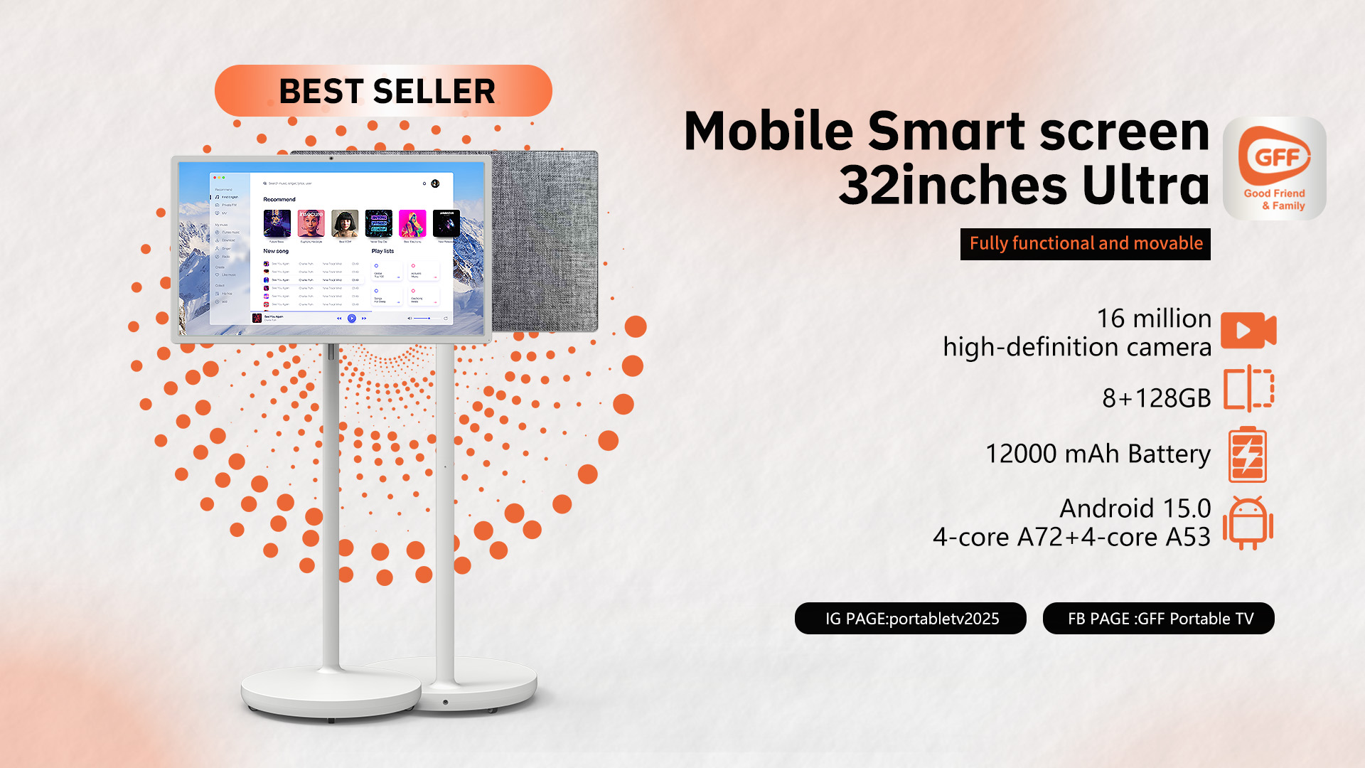 At the heart of any family gathering is the shared experience of watching a great movie, playing a game, or streaming the latest TV shows. The GFF Portable Smart TV features a stunning 32-inch UHD IPS screen (3840*2160) that ensures every member of the family can enjoy crystal-clear visuals and vibrant colors. Whether you’re watching the latest blockbuster or engaging in a competitive gaming session, GFF delivers an immersive experience that everyone can enjoy.